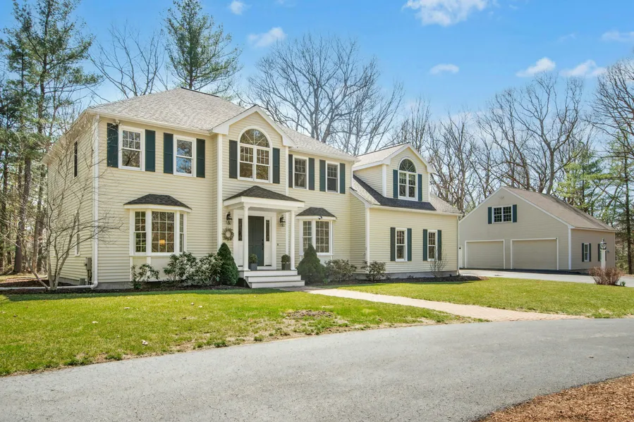 Car enthusiasts, hobbyists & those seeking potential detached living quarters—this one has it all! Sunny Colonial privately sited on 6 acres, offering space, flexibility, and incredible bonus features. Two-story foyer opens to formal living & dining rooms with pocket doors. Eat-in kitchen with cherry cabinets, updated appliances, and breakfast bar flows into vaulted family room with gas fireplace. Bonus vaulted play/sitting room with wrap-around windows & slider to deck. First-floor private home office with bay window. Expansive primary suite with soaring ceilings, dual walk-in closets + bonus closet, and spacious bath with jacuzzi tub, tiled shower, double vanity, and linen closet. Finished basement play space & 2 large storage rooms. Detached garage structure includes 2 bays on the main level (1 heated), additional 30x33 garage bay on lower level, and unfinished second floor with potential for ADU/apartment, or office. <5 min. to Rt. 2, S. Acton MBTA train, and <10 min. to W. Concord