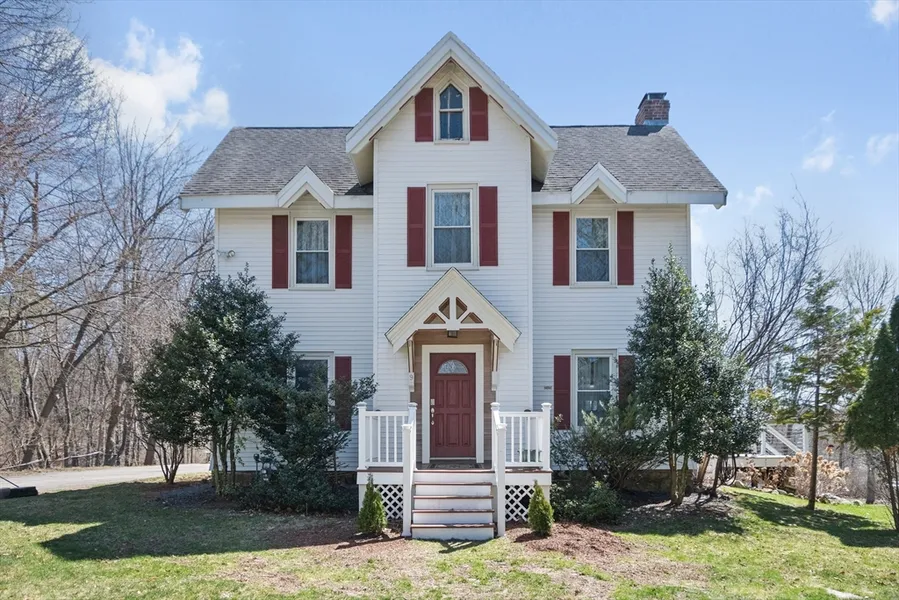 Victorian Colonial offers a combination of traditional charm & modern functionality. Set back from the street on 1.4 acre, providing privacy, serene views & access to 31 acres of conservation area w/trails. Architectural details include welcoming foyer w/grand staircase, custom moldings & millwork soaring & vaulted ceilings, large windows are enhancing this home's character while blending antique charm & eclectic style. Bright & airy rooms offer versatile functions. The newly renovated & expanded kitchen w/custom cabinetry, marble countertops, SS appliances, large island opens to dining area w/sliders to a large deck, seamlessly transitioning to the lush surroundings. FMR with wood-burning stove/fireplace, creates a warm atmosphere. 2nd floor features 3 spacious BRMs sharing 2 full bathrooms, 4th BRM on 1st floor w/cathedral ceilings, perfect guest suite/office/studio. Attached 2stoey ba...