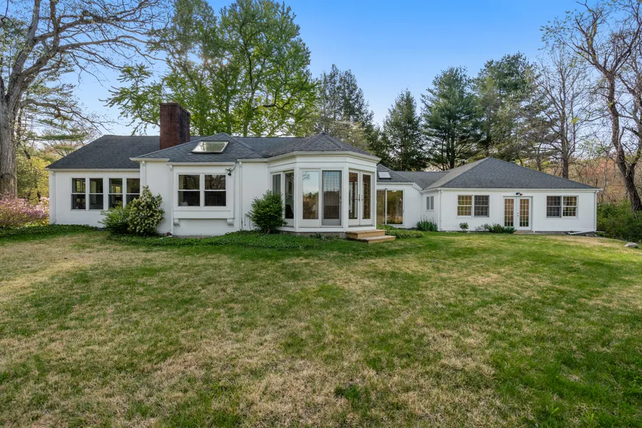 This sun-drenched country retreat features expansive windows and glass doors throughout framing stunning views in every direction. Its thoughtful design seamlessly blends the indoors with the surrounding landscape. Enjoy peaceful moments and observe local wildlife from the elliptical sunroom or relax on the private stone patio. The open-concept layout features a casual kitchen and dining area that flows effortlessly into a spacious living room complete with a cozy fireplace. Soaring ceilings and rich hardwood floors enhance the sense of space and warmth. The versatile single-level floor plan includes a spacious primary suite and two additional bedrooms. A mudroom/office leads to a striking family room addition highlighted by a vaulted ceiling that adds dramatic flair. A heated oversized two-car garage allows for ample storage. A five bedroom septic system allows for future expansion or customization. Conveniently located to the commuter train to Boston.