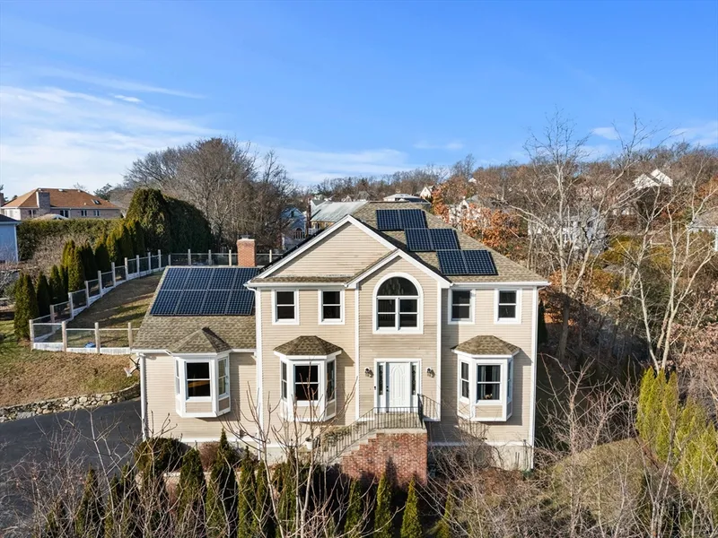 Beautiful Colonial in Coveted Pigeon Hill Estates! Perched high in one of Waltham's most desirable neighborhoods, this sun-filled Colonial offers an inviting open floor plan ideal for modern living. The open foyer leads to an updated kitchen with dining area that flows into the cathedral-ceiling family room with a fireplace-perfect for entertaining or everyday comfort. A private first-floor office, half bath and laundry room complete the main level. Upstairs features three spacious bedrooms, including a large primary suite with a luxurious en-suite bath and California-style walk-in closets, plus a main hall bath. The finished lower level offers bonus space with direct access to the two-car garage. Additional highlights include a 2016 roof, owned solar panels, and a Tesla whole-home battery backup for outstanding energy efficiency and backup power. Enjoy the expansive backyard with a large patio and sweeping views of Boston.
