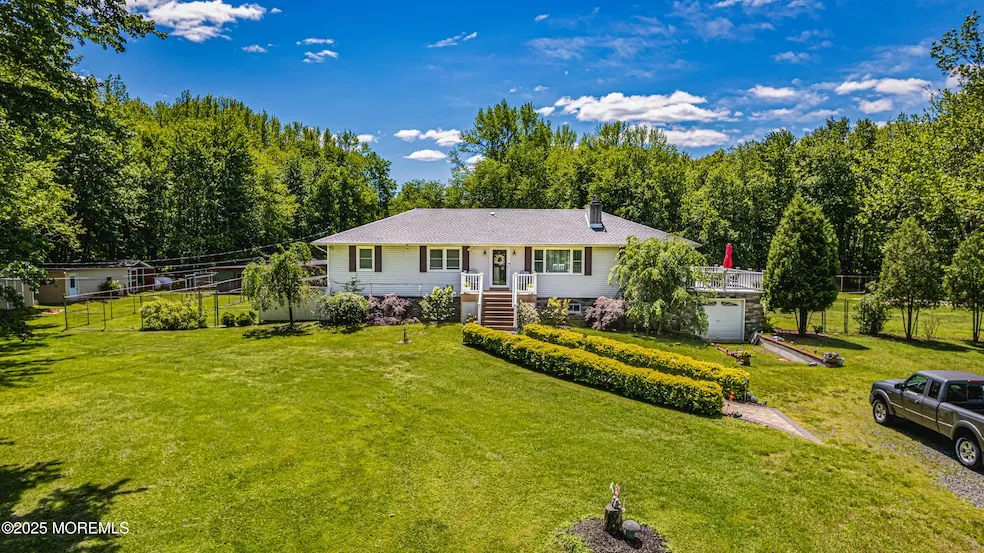 Talk about Unique! . This completely remodeled raised ranch sits on 7.3 glorious acres on Texas Rd. Set back from the road, this property offers a prairie-like setting. The house features an open floor plan. A beautifully remodeled kitchen with granite countertops and stainless steel appliances. Spacious living room with gas fireplace. Two gorgeous remodeled bathrooms. There is recessed lighting in most rooms and a spacious home office/den. The primary bedroom is oversized as it was at one time two bedrooms,( Can easily be converted back to three bedrooms). The second bedroom is generous with ample closet space.. The basement offers work stations and LOTS of storage. The garage features even more storage and will easily shelter one vehicle from the elements. The exterior of the home offers vinyl siding with stone overlay on the front. The WRAPAROUND composite deck is wonderful. Imagine yourself overlooking the spacious property with a fresh-brewed coffee in the morning, or enjoying libations at the end of the day. The home also features a whole-house generator for your protection and peace of mind. There are caged dog runs, a handball wall, and a basketball hoop for your enjoyment. You will also find THREE stick-built storage sheds to the side of the house. They are in GREAT shape and all have electricity. For DECADES, this property was the home of one of the PREMIER German Shepherd breeders in NJ. The property was also the home of a kennel, grooming and boarding business. There are two outer buildings with approximately 2700 sq feet of space. These were the grooming and kennel buildings. Both buildings have heat. The property is zoned R120 (Residential 120,000 sq feet). The entire lot is approximately 321,000 sq feet. There is room to subdivide with variance. ( Buyer to do their due diligence) The land use is still General Commercial (specifically a kennel). The outer buildings are perfect for a small business owner to store supplies, and there is ample space near the back buildings for a fleet of vehicles. The seller is including a 1 1-year home warranty from Cinch. Bring your vision and enjoy this property as the current owners have for years!
