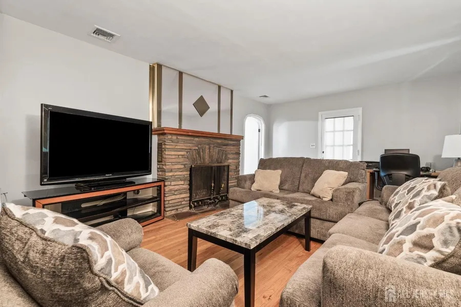 Welcome to this warm, charming & inviting ranch offering versatile living space. Step into a sun-filled foyer & spacious living room, featuring gleaming hardwood floors, a beautiful stone-front wood-burning fireplace w/wood mantel, & overhead lighting ideal for cozy evenings or entertaining guests. The flexible layout includes a family room w/ laminate floor, overhead lighting, & French door to the backyard. Originally used as a dining room, this space now serves as a 4th bedroom & can easily be converted back. It includes carpeting w/ hardwood underneath, a closet, windows, & a lighted ceiling fan. The spacious eat-in kitchen offers wood cabinetry, ceramic tile flooring, a tile backsplash & plenty of storage. A door from the kitchen leads to a w-up attic w/fixed stairs, standing height & electricity perfect for storage or future expansion. There's also a door from the kitchen to the bac...