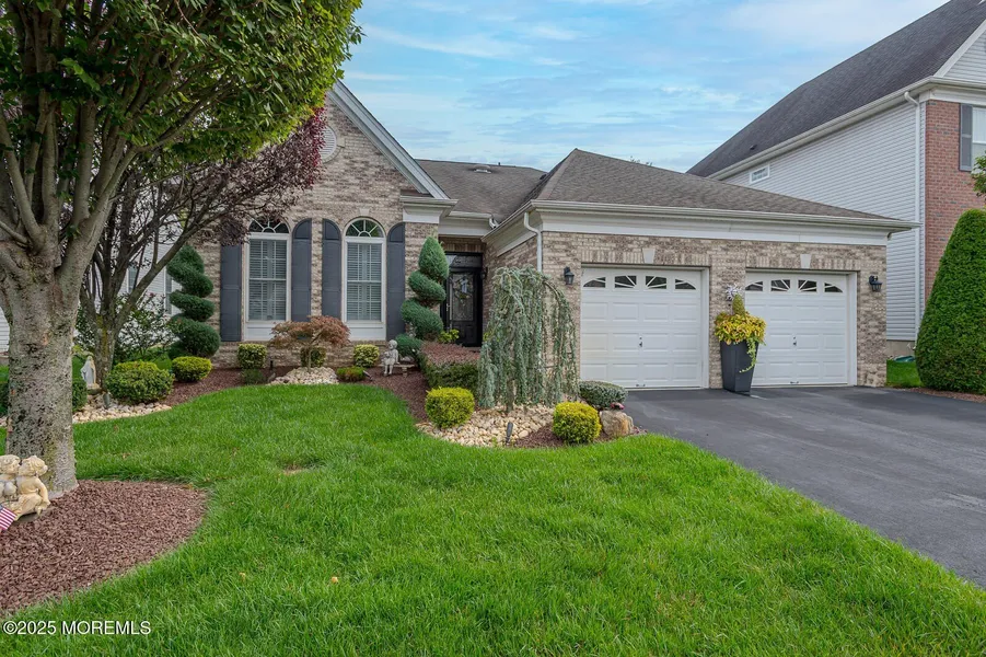 From the manicured professional landscaping to the etched glass front door w/ NEW storm door, you will know this brick front Monaco is it! Enter onto immaculate HW floors. A large LR/DR combo is right off entryway - plantation shutters highlight the windows. The Kitchen features top-of-the-line cabinetry, large center island open to Great Room, granite countertops, SS appliances, dble oven, 5-burner cooktop & subway tile backsplash. The eating area has sliders to the cozy patio w/ sitting wall, built-in lights & overhang for shade - fencing & landscaping afford this backyard privacy. The Great Room (currently being used as DR) is large and leads to a BONUS Sunroom w/ another set of sliders to the brick paver patio. The Master BR is spacious & luxury Master Bath w/ clear glass shower enclosure & stone countertop. The Guest BR located conveniently next to Guest Bath. WHOLE HOUSE GENERATOR~...