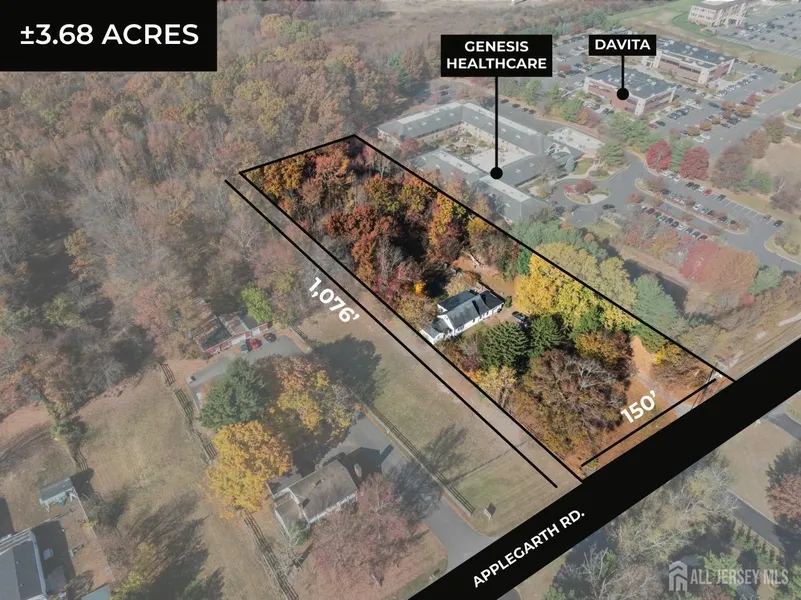 FOR SALE: 3.68 Acres of Land on Applegarth Rd. This commercial property is located in a highly sought after section of Monroe Township, just minutes from Forsgate Drive, the NJTP Exit 8A, and expansive residential communities such as Clearbrook, Rossmoor and Concordia. The property is Zoned: PO/CD (Planned Office Commercial District). This zoning allows a range or permitted uses such as: Professional Office Related Uses Such As: Corporate Centers, Data Processing Facilities, Computer Centers, Law and Accounting Offices, Research Offices, etc. Medical Uses: Doctors Offices like Family Practice, Urgent Care, Nephrology, Cardiology, Podiatry, Spine and Wellness, Physical Therapy, Orthopedics, General Dentistry, Orthodontist, Adult Daycare, Special Needs Day Program, Counseling and Therapy, etc. Retail Uses: Restaurants, Banquet Halls, Pharmacies, Banks or Financial Institutions. Sports and Health Facilities: Tennis Centers, Racquetball Centers, Health Spa, Swim School, Training Facility, etc. The prime location makes it ideal for any Medical Group looking to build their own building and establish a practice in a desirable location in Monroe Township. Also ideal for any buyer looking to build and open a restaurant and banquet hall. Liquor License potentially available to purchase as well (not included in the asking price.) Real Estate Taxes: $9,430 per year Property is 150'x1,076' Property has City Water and Gas. Sewer available at the Street. Currently Improved with a tenanted residence. (Please arrange appointment in advance to visit the property) Please call Broker for more information.