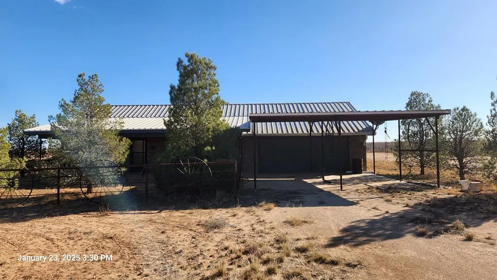 The Wheel House Ranch 15 Prestine Acres with Some of The Most Amazing Unique Decorative Western Metalwork & Antique Wagon Wheels Hence the Name, Cleared Off with a 2 Bed, 1 Bath, 2 Car Garage, w/ 2 car Carport Brick House, build in 2006 Strong Great Foundation no cracks or settling. 2721 sqft Shop w/ Cast Iron Stove. Has a set of working pens. Tall Pine Trees & clean layout. Big Power All Around, yet Clear Skies at Night for Great Star Gazing. Its still a Blank Canvas, You will Not want to Miss Out on This One.