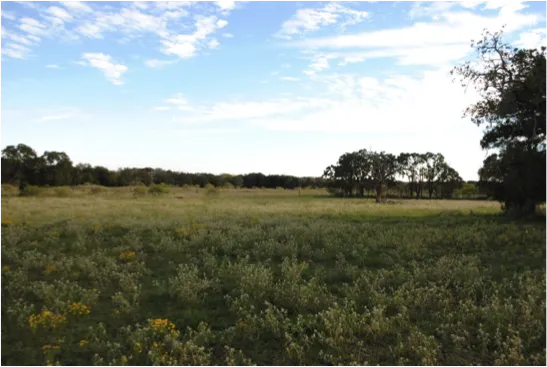 This property is also located in between county road 324 and 325. It offers a symmetrical shaped layout and large front open pasture, and has sections of manicured oak trees towards the back of the property to the west. Native grasses, various wildlfowers, and scattered coastal comprise the forage base while the soil ranges from a clay loam in the lower elevation to a sandy loam soil towards the top of the hill. This hill offers great views and is higher than any other areas surrounding the property, and has a height of 480. There are several possible pond locations that become apparent on this property. It has 708 of road frontage.