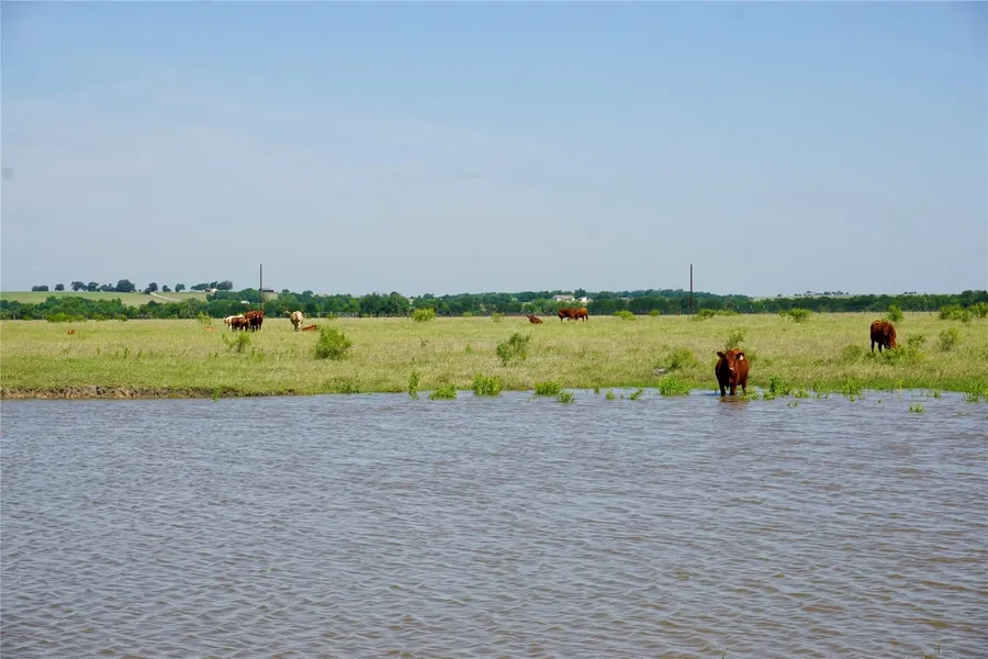 The land is mostly level with gentle elevation changes and scenic long-range views to the rear. A centrally located pond adds functionality and appeal, while native grasses, wildflowers, and scattered cactus create a classic Central Texas landscape.