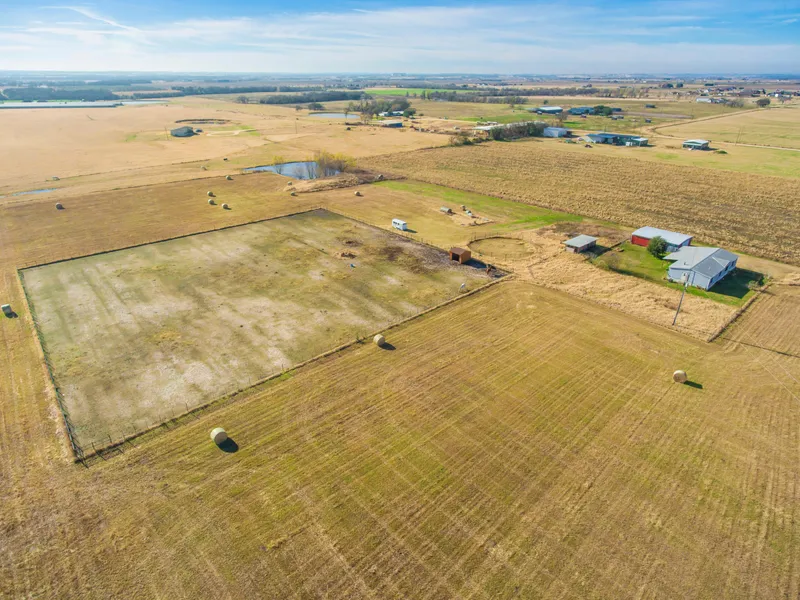 12.84 acres on a quiet country road, surrounded by larger ranch/farms, stock pond back of property. Property includes a well cared for mobile home, great steel framed workshop/garage book ended with two steel cargo containers, hay production of tifton grass, cross fenced for horses.