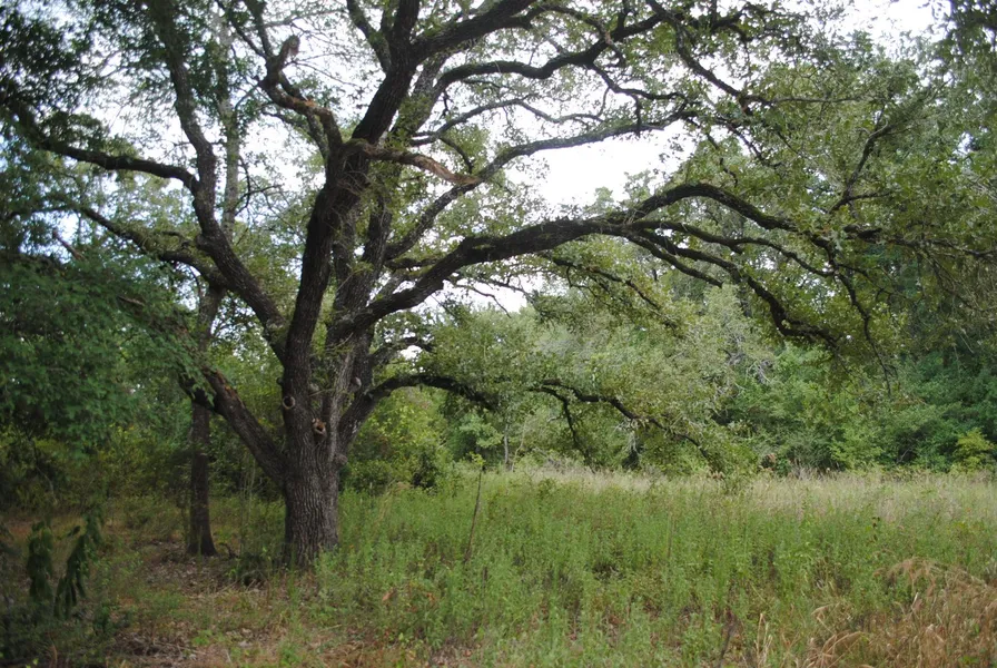 This property is mostly wooded, with several clearings. Many big oak trees, with cedars, mesquites, and elms mixed in. Wet weather creek in the rear of the property is home to deer and hogs. Fenced on three sides. Native grasses.