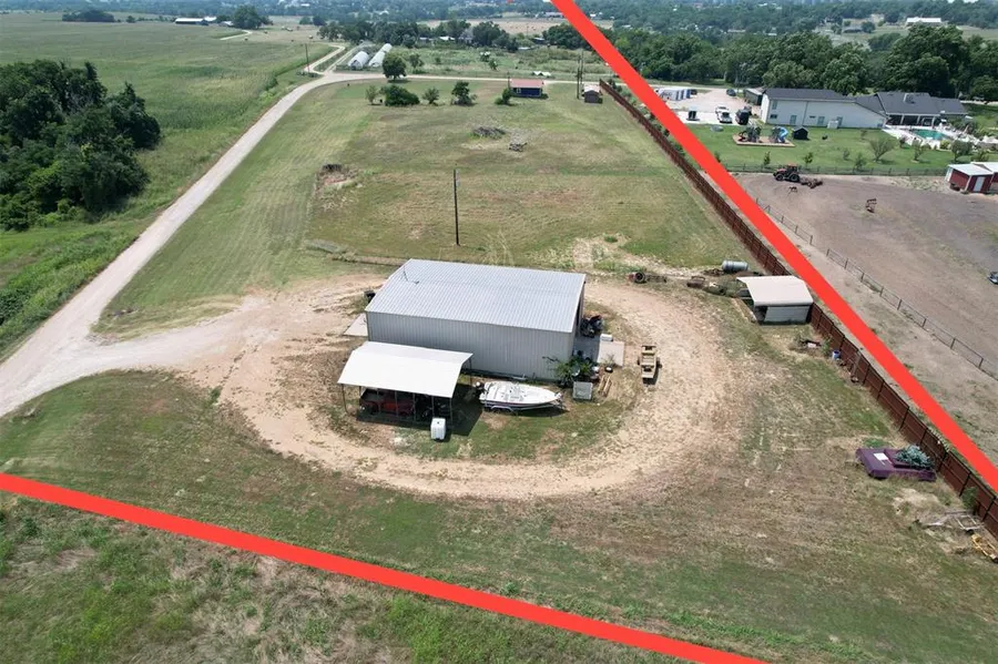 3.46+/- acre corner lot on hilltop with sweeping views of Brushy Bottom. On South end of the property there is 40X60X16 metal shop on concrete slab with office area and air compressor room. Shop has 12 ft roll-up doors on the East and West ends. Shop has electricity and water connected. One bedroom cabin sits on the North end of the property, and is used as temporary lodging. Water comes from SWMWSC, and electric is through ONCOR transmission system.