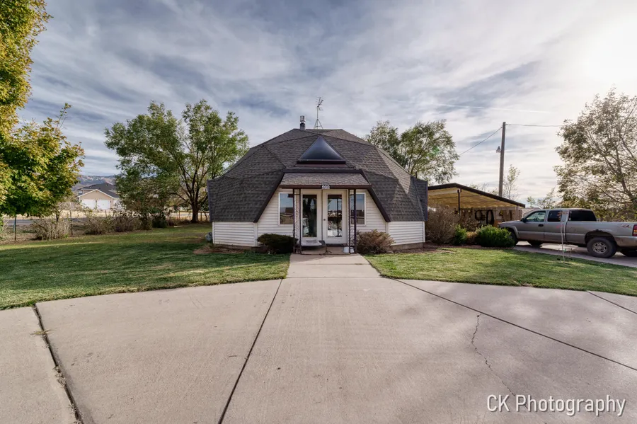Welcome to this one of-a kind, dome shaped home! This 2-bedroom, 1-bath home offers a truly unique living experience. Step inside to find spacious, light-filled rooms with high ceilings that enhance the home's airy, open feel. The loft offers extra space for a game room or another bedroom! Outside, you'll fall in love with the beautifully landscaped yard that includes a little orchard of fruit trees and plenty of room for gardening. BONUS! The new hot tub in the backyard is all set up and will be included! This home is situated close to the mountains offering you easy access to the mouth of the canyon and ATV trails! Come take a look at this one of a kind home today!