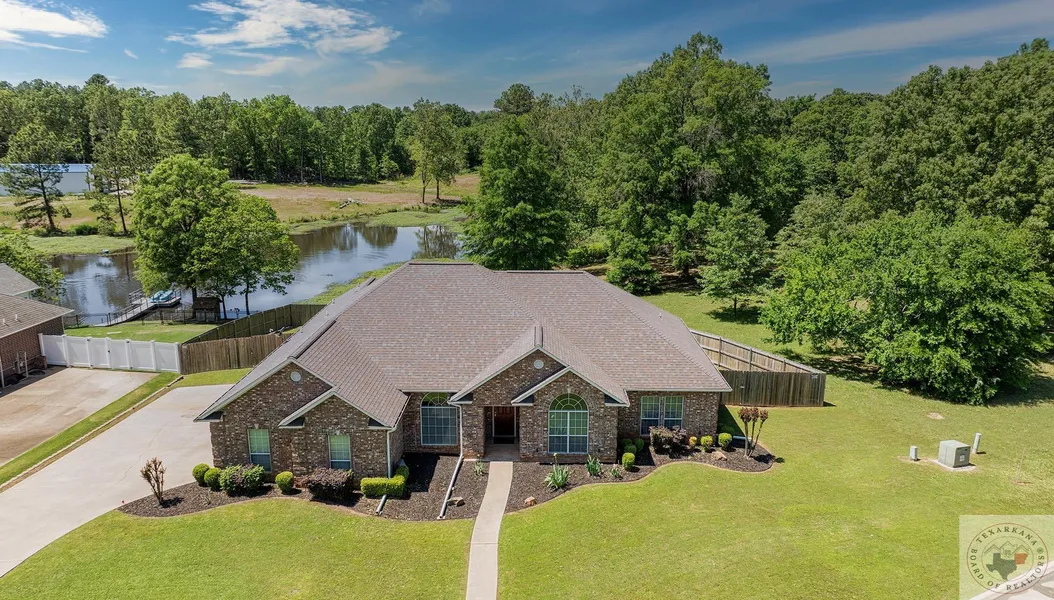 This move in ready 4 bedroom, waterfront home, north of I-30 in Texarkana, Arkansas is a fabulous find! Located in a popular subdivision where you can get your steps in easily, walk out back and fish, and make effortless commutes. Walking in we have a formal dining off the entry with a vaulted ceiling and large arched window, beautiful from inside and out. Into the kitchen you'll find granite countertops and backsplash, lots of nice cabinets, an island workspace and a breakfast nook that overlooks the backyard and pond. The living room has lots of windows, a tray ceiling for added detail, a fireplace with TV hookup and a built in bookcase. A speaker system as well as video surveillance are already in place. The master suite is a spacious area with a large bedroom with a door out to the patio, his and hers closets, vanities, jetted tub and a walk in shower. Across the home are 3 generous bedrooms with nice closets, one with a vaulted ceiling another with rear views of the water and a door to the patio, perfect for wowing guests. A hall bath with bathtub and shower and long countertop makes morning routines easy. Well appointed laundry room near the garage where you'll find a storage room to stow your equipment. There is also a half bath to accommodate guests. Out back the covered patio is the perfect perch to watch sunsets and birds landing on the pond. The yard is privacy fenced with gates to allow easy access down to the water, while keeping kids and pets secure. New carpet, blinds, paint are a real treat. Fully refreshed, this home is ready for new owners.