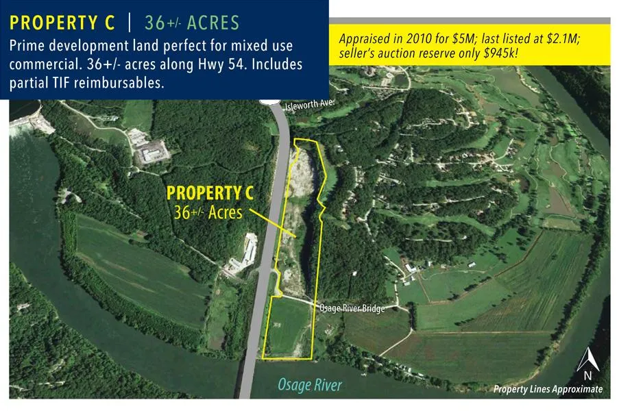 Research Parcel InformationDirections to AUCTION INFO CENTER: From US HWY 54 Northbound, go east on Isleworth Ave. (approx. 9/10 mile north of Osage River Bridge), to Osage Hills Rd., east to Osage River Bridge Rd., north to Clubhouse. From Southbound US HWY 54, turn east at Osage Hills Rd., follow Osage Hills Rd approx. 1.5 mi. to Osage River Bridge Rd., north on Osage River Bridge Rd to clubhouse.