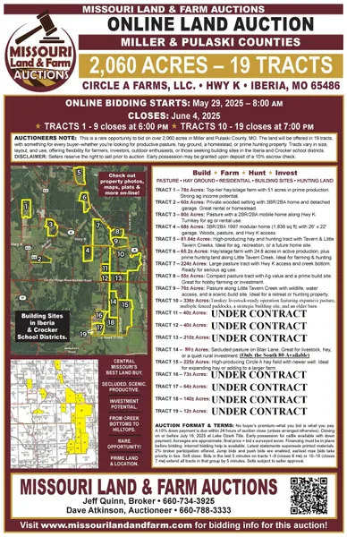 This is a rare opportunity to bid on over 2,060 acres in Miller and Pulaski County, Missouri. The land will be offered in 19 tracts, with something for every buyer whether you're looking for productive pasture, hay ground, a homestead, or prime hunting property. Tracts vary in size, layout, and use, offering flexibility for farmers, investors, outdoor enthusias...