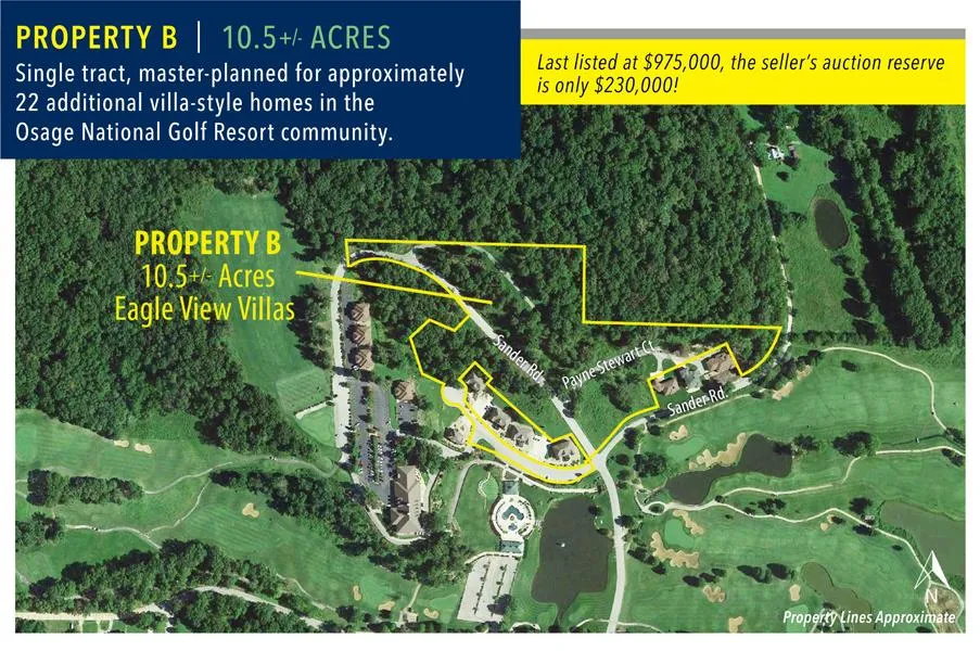 Located adjacent to the clubhouse in the northern part of the Osage National Golf Resort, this 10.5+/- acre tract is part of the Eagle View Villas area of the community. The original plan for this tract contemplated approximately 22 patio homes, villas, or condominiums (existing structures are not included in the sale). The new owner will determine how best to continue development. The individual home sites have not been subdivided as they are segregated upon construction of each new structure. Utilities exist on the property. Last listed for $975,000, the property will sell to the highest online bidder over the sellers reserve of $230,000!