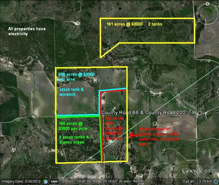 Please refer to Property ID: 1094169. This propert has older remodeled 1000 sqft +/- home with three bedroom, one bath, and pool that is currently drained. There is a bunk house that is 800 sqft +/- with a full bath and a 1500 sqft +/- large metal barn. Small portion of Simms Creek, LCRA waterline, and electric well. Is property in red.