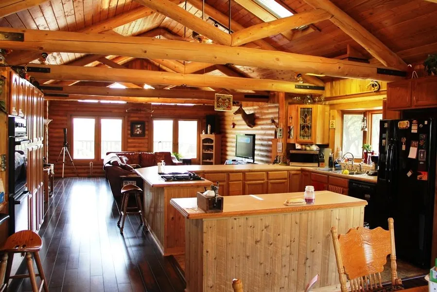 The features of this ranch provide all one would want in a country property. The custom log home is located toward the back of the property, sitting on a hill that overlooks the entire ranch. No close neighbors here, just peaceful privacy! The back of the home features a large upper deck overlooking the back of the property, and a scenic creek bottom. Walk- around decks on the south, east, and west sides of the home provide you with plenty of room to entertain outside, or just to sit and enjoy the wildlife!