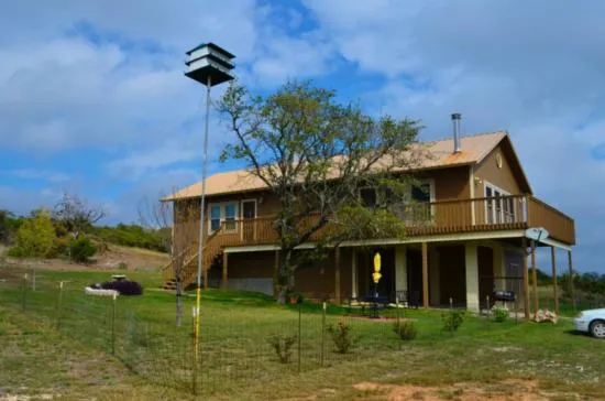 Beautiful hill country ranch with deer and wildlife! Sit on balcony of home and watch the deer grazing by the stock tank! Nice two story home with large open living, dining and kitchen area on upper floor with great windows providing sunlight and beautiful views. Living area has a wood burning stove in the corner, providing ambience and warmth for the cold winter nights. Home is very well maintained and has central heat and air, energy efficient triple pane windows, good insulation, ceiling fans, metal roof and recent exterior paint. The master bedroom is upstairs and very large with bath, large walk in closet and a utility room upstairs (2nd utility room downstairs). Upper floor can be accessed by outside stairs and also interior stairs.