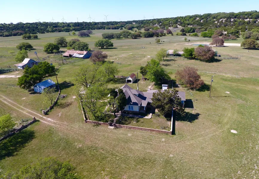 Outside the home you will find rock walls, rock outbuildings, cabin, cellar, multiple barns, sheds and pens. Fields are pastures are cross fenced to allow for stock rotation. There are 3 nice stock tanks in SE pasture and 2 stock tanks north of home. Water well services home and water troughs. Northern part of this ranch is a beautiful tree covered ridge. The views are absolutely stunning in every direction. Tree cover is a mix of live oaks, Spanish oaks, cedar and some mesquite. Deer were seen multiple times while taking pictures. Huge rock outcroppings add to the overall majesty of this mountain top. Elevation is greater than 1,750 feet on mountain top.