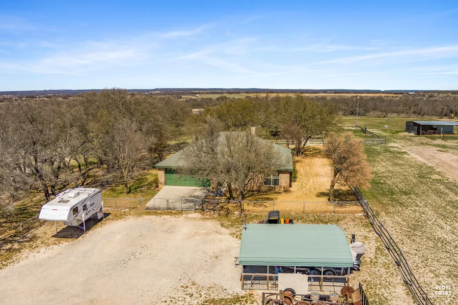 This 11 +/- acres with 3/2 brick home offers the peace and quiet of country living. The home sits on a hill with views and several large mature oaks for shade and over 180 oaks on the property. Inside the home the flooring is wood laminate and carpet, the living area has a wood burning fireplace, and the kitchen has plenty of cabinet space. The windows throughout the house are large and allow for natural light and great views of the land and yard area. The yard is landscaped with the native live oaks, crepe myrtles, St Augustine grass, rose bushes, and other shrubs such as Texas Sage. A water well supplies the water for the yard and the house. The backyard area features a wood deck with hot tub for relaxing in the evenings.