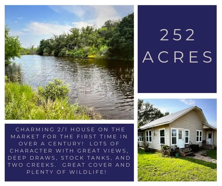 252 +/- acres west of Goldthwaite with charming 2/1 house on the market for the first time in over a century! Lots of character with great views, deep draws, stock tanks, and two creeks. Great cover, and plenty of wildlife! Shape of property on map and precise acreage is to be determined due to property being divided between siblings. $6,500/acre