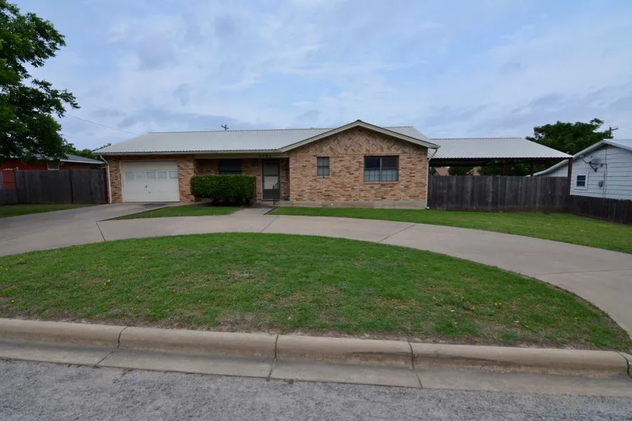 Beautiful, immaculate home that you will love from the minute you drive up. Brick exterior, metal roof, circular drive, attached garage, large back yard with privacy fence and more! Home is open concept and feels spacious and warm. When you enter the living & dining area are to the left with bedrooms to the right. Both bedrooms are large with good closet space. Master bath has shower only which is tiled and second bath has tiled tub shower combo. Foyer, living and dining area are all one large space which flows into the kitchen. Kitchen is roomy and functional with an abundance of cabinet and countertop space. There is also a desk area perfect for home office or homework station. Located just off the kitchen is the utility closet with additional cabinet space. On the back of home is an enclosed porch area that has served as a bedroom but would be an ideal plant, exercise or playroom! Matching ceramic tile in all areas except the bedrooms and enclosed porch. Carpet in both bedrooms. The back yard is large with beautiful shade trees and a huge plus is the privacy fence. This fence is in excellent condition with double gates to the alley behind the home. Another backyard bonus is the storage building that has been converted to an awesome living area. This unique space has it's own bathroom with shower and is spacious enough for a bed and other small furniture items. A 2 car carport has been added to the north end of the home. This can be accessed by removing the front section of the privacy fence or use it as a covered patio or play area. Location is superb - within walking distance of all GCISD campuses and the neighborhood is second to none.
