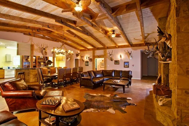 Lodge features 5 bedrooms, 2 baths, stained concrete interior floors, large rock fireplace, vaulted main room, spacious kitchen, and a high-ceiling game room