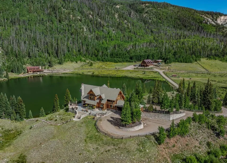 The estate includes several well-appointed structures, highlighted by an Engelmann Spruce Log Cabin with 4,193 square feet of living space, extraordinary high ceilings, a floor-to-ceiling three-story fireplace, and expansive windows that showcase the property’s breathtaking views. Additional improvements include a large barn with a caretaker’s apartment above, a second log cabin, a fully equipped workshop, and a dedicated yoga/exercise room near the main house.