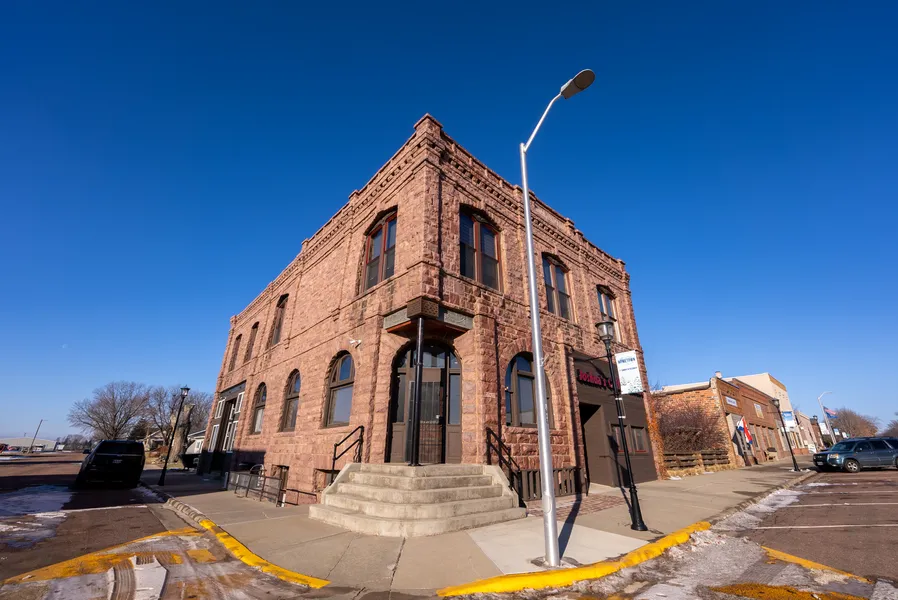 This historic mixed-use building in South Dakota, built with Sioux Quartz, offers a blend of commercial and residential space along with additional land. The ground floor boasts commercial areas with impressive 10' to 14' ceilings, beautiful wood floors, and abundant character. Currently divided into two vacant commercial units, they are ready for leasing. Access the second-floor loft through a spacious 20' x 22' entry foyer with a soaring 14' ceiling. Upstairs, discover expansive ceilings ranging from 12' to 14', large windows, efficient heating and cooling, a wood-burning stove, original wood floors, a luxurious primary suite, two guest bedrooms, a gourmet kitchen, study, den/studio, and in-suite laundry. The basement hosts a separate 1-bedroom apartment with its own outside entrance, offering additional living space. Parking options include both on-street and off-street spaces. Added ...