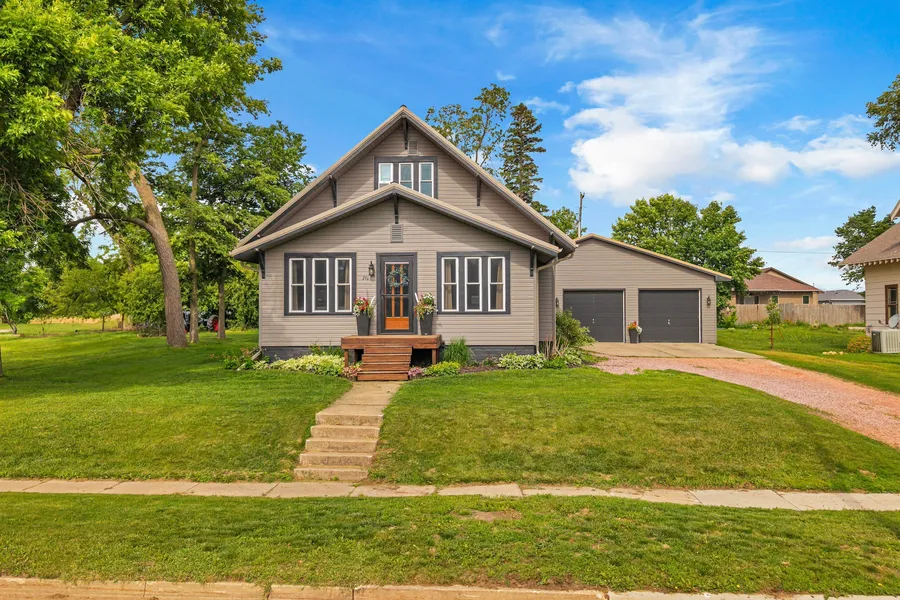 Small-Town Charmer with Modern Updates and Classic Appeal! This beautifully updated 1.5-story traditional home offers the perfect blend of charm and functionality. With eye-catching curb appeal, you’ll appreciate the newer vinyl siding, soffits, gutters, and durable metal roof. Step inside to discover stunning original woodwork throughout the main—unpainted millwork that adds warmth and character. The inviting front porch opens to a finished, enclosed office space complete with a cozy fireplace, perfect for working from home or relaxing with a book. The spacious living room flows into the formal dining area, featuring stylish new light fixtures and a charming original built-in breakfast bar. The updated kitchen boasts oversized flat-panel oak cabinetry, a modern backsplash, pantry, and high-quality appliances—including a gas stovetop for the home chef. The main level includes two comfortable bedrooms and a fully updated bathroom. Upstairs, you’ll find a generous primary suite with an exceptional 12x13 walk-in closet for a smart, functional layout. The finished basement offers additional versatile space, including a second office area, a large family room, and an extra bathroom—ideal for entertaining, working from home, or accommodating guests. Outside, enjoy a spacious 3-stall garage, large patio ideal for grilling and entertaining, and a private backyard with no rear neighbors—your own peaceful retreat!