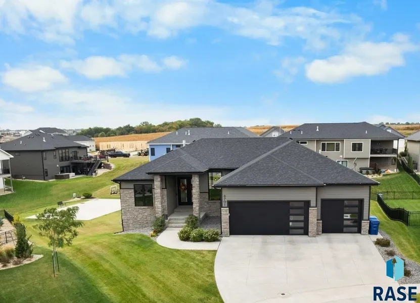 Welcome to this stunning, luxe home located in a quiet cul-de-sac in Mystic Heights-just steps from Fred Assam Elementary and within the top-rated Brandon School District. This walk-out ranch-style home blends everyday comfort with upscale style, offering designer finishes, smart layout choices, and exceptional attention to detail throughout. From the moment you walk in, you're greeted by soaring coffered ceilings in the oversized living room with ultra sleek fireplace, motorized blinds, and a seamless open-concept design. The chef's kitchen impresses with quartz countertops, custom birch cabinetry, gorgeous tiled backsplash, a large center island, and an oversized delightful hidden walk-in pantry. The main level features three generous bedrooms, including a luxe primary suite with heated bathroom floors, a walk-in tiled shower with two shower heads, dual vanities, heated floors and a spacious walk-in closet with custom shelving. The main-floor laundry offers built-in drying racks and storage, while the smartly built-out drop zone helps keep everything in its place. Head downstairs to a fully finished walk-out lower level designed for entertaining. Enjoy a spacious living room with a second fireplace, full wet bar, game area, and cozy breakfast nook. The lower-level bathroom includes heated floors for year-round comfort. A versatile flex room offers the perfect flex space for a rec room, office, playroom, or home gym-an ideal extra rarely found at this level. Step outside to a huge backyard featuring an oversized stamped concrete patio, a covered deck, and your very own spacious basketball/pickleball court-perfect for tournaments or playdates. Permanent holiday lighting is already installed, adding effortless charm throughout the year. The oversized, heated, and fully finished garage is insulated and smartly designed for storage, hobbies, and real-life convenience. Throughout the home, you'll find customized closet systems and built-in shelving, elevating both function and flow. This home offers luxury, functionality, and unbeatable location in one of Sioux Falls' most desirable communities.