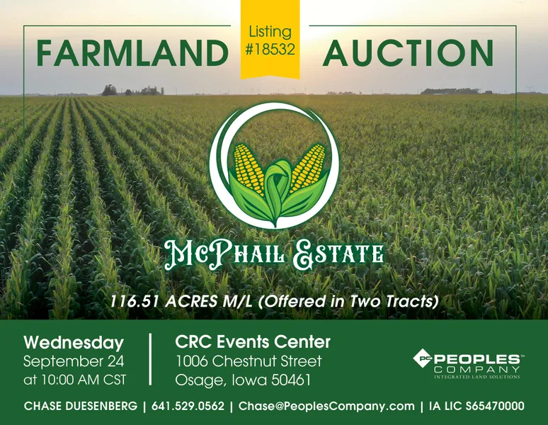 Mitchell County, Iowa Farmland Auction - Mark your calendars for Wednesday, September 24th, 2025! Peoples Company is honored to represent the heirs of the Russell G. McPhail Estate in the sale of 116.51 acres m/l located northeast of Osage, Iowa, or just south of Little Cedar, Iowa. The farmland will be sold as two individual tracts through the Buyer's Choice Auction Method, taking place at 10:00 AM at the CRC Events Center in Osage, Iowa.