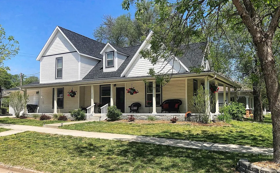 Fantastic story-and-a-half home on a shaded corner lot in Beloit, KS. This beautiful farmhouse style home has an inviting wrap-around porch with great curb appeal. Featuring a main floor master bedroom with en suite bath and coffered ceiling.