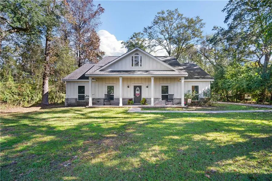 Fabulous LIKE-NEW construction in Saraland almost an acre lot. This gorgeous craftsman style home was custom built in 2018 and is definitely one of a kind. This 3BR/2Ba home features an open floorplan featuring beautiful laminate flooring, granite countertops, white cabinets, backsplash, pantry with custom door, and stainless appliances. To the right of the living area is the primary suite with ensuite bath featuring vessel tub, custom tile shower, and dual vanities. On the opposite side of the home are the additional two spacious bedrooms and bath. The bathroom featuring a single vanity and bathtub with tile surround. Now step outside onto the covered back porch with wood accents overlooking the spacious backyard with above-ground pool and storage building. This home includes 2 lots making it just under an acre in total. Sale will include parcel #R022202044002076.002. Contact your favorite real estate agent to schedule a showing before it is gone!