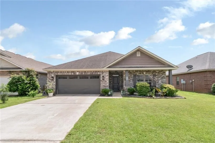 Stylish, move-in ready, and filled with natural light—this beautifully maintained home offers comfort, function, and modern touches throughout. Welcome guests on the covered front porch, then step into a spacious foyer that sets the tone for the inviting interior. Just off the hallway are two secondary bedrooms with generous closets and a full guest bathroom. The open-concept layout features a split bedroom design, with the living room boasting soaring ceilings and abundant windows that fill the space with natural light. The kitchen includes an island bar with a double sink, a walk-in corner pantry, and granite countertops, and flows seamlessly into the breakfast area with backyard views and direct access to the patio. The primary suite showcases a wood-accented tray ceiling, large windows, and a luxurious bath with a double vanity and sitting area, soaking tub, separate shower, walk-in closet, and linen storage. Conveniently located off the primary suite, the laundry room connects to the mudroom, which offers built-in bench seating, storage cubbies, and hooks—perfectly situated just inside from the attached two-car garage. Additional highlights include crown molding, tray ceilings in the living room and primary bedroom, updated modern light fixtures, and luxury vinyl plank flooring throughout. The backyard offers a patio area and a wooden privacy fence, ideal for outdoor enjoyment. The Seller plans to leave the Aroma360 – The Art of Scent Vangogh360, which is used in conjunction with the home's central air conditioning system, ensuring the home smells as lovely as it looks. Completely repainted in 2022, this home is truly move-in ready. Call today to schedule an appointment to make this home your New Beginning! Buyers and their agents should verify all pertinent information.