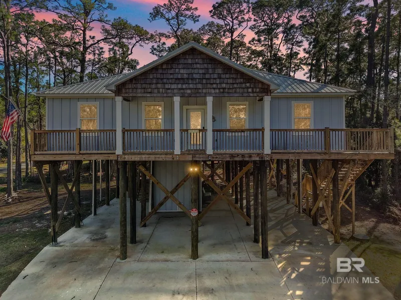 Built in 2023 by Tyler Cooley, this is a great opportunity for this vacation get away with 2nd floor deck salt water pool that includes a lift. Well-built property features turn key property with furniture included in the east end section of Dauphin Island. It is just a block to the bike trail as well as the Island Mardi Gras parades. Multiple parks such as the Audubon Bird Sanctuary, Fort Gaines, the Isle Dauphine Golf Club, and beaches are nearby. The home is an open concept floor plan with easy care luxury vinyl plank flooring throughout the kitchen, dining area, and living room with vaulted wood accented ceiling. The kitchen features a pantry, granite countertops, white shaker style cabinetry, with Samsung appliances such as an electric stove, large fridge, and dishwasher. Each of the 3 bedrooms have their own bathroom; additionally, the large 12 x 10.8 laundry room has more room for pull out type of bed or office area if needed. Currently, it features fun arcade games. The primary bedroom is 13 x 12 and has a king size bed with nice granite vanity and tub shower combo. The other two bedrooms are roomy with one featuring a bunk style set up with each their own bathroom. All have tub/shower combos and granite counters with beautiful cabinetry vanities. Off the living room is a wonderful screen porch with fan and tv. Beyond the porch is a large deck with 23 x 10 pool without having to go downstairs. Not only is the pool heated; it can be cooled as well! There are two sets of stairs; one at front door porch area and the other services the back porch/ pool area. Imagine a drink by the pool catching one of the island breezes or hosting parties as there are so many spaces for socializing. Below this raised beach style home, there is plenty of parking for yourself as well as visitors with well built concrete underneath the raised property. It's a cool place to sit and socialize; there is even a fun jungle gym taking advantage of the cool shade under the home.