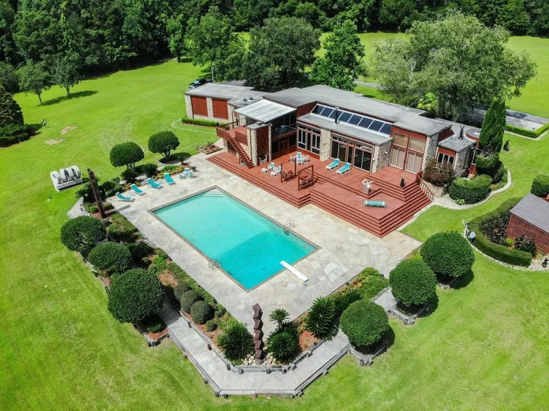 If you are looking for a one of a kind property then look no further! Contemporary Cypress and river rock custom home sitting on 95 +/- of the most well manicured acres around. About 1/4 of the property is beautiful open field and the remainder is heavily wooded mature hardwood timber. The custom home has 4 large bedrooms and 3.5 baths. Master bedroom is on the main level and has a fireplace, whirlpool tub and separate shower. 3 bedrooms upstairs with living and dining room on main level separated by a free standing wood burning fireplace overlooking the 57x20 gunite pool. The pool is surrounded by a large wood patio, grill, outdoor shower and screened porch. There is an office, home theater room and 2 car garage. The Cypress ceilings range from 9-19'. There is a separate barn and plenty of room to land a helicopter. The home is perfect for large family gatherings or entertaining busines...