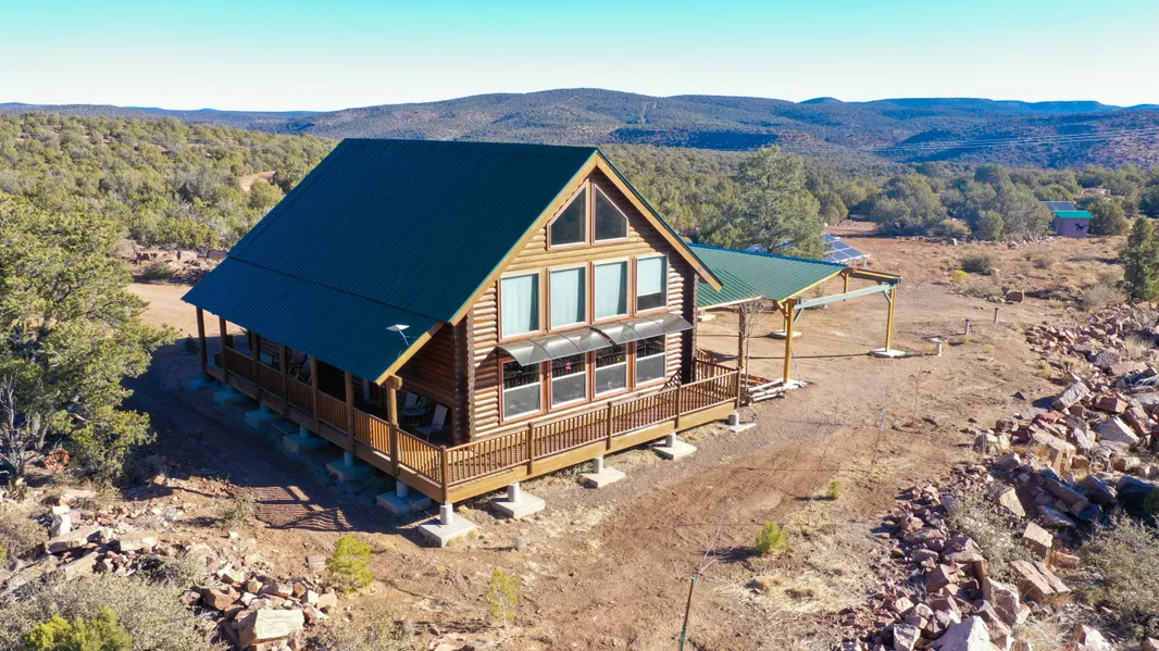 This beautiful log-cabin is on 36-acres filled with Juniper and Pinion Pine trees, adjacent to 640 acres of State Trust land. (Possibility to purchase 72 acres--adjacent acreage also for sale, separate owner.) It's a peaceful retreat lovingly built with creature-comforts including an open-floorplan great room that contains the kitchen, dining area, and living room area. This leads to a gorgeous wood staircase with a log railing taking you to the spacious second-floor loft. The two bedrooms and two baths are just down the hall, one with an en-suite that has a soaking tub. Laundry hookups for a washer and propane dryer are in the 2nd bath. The private well has 8 GPM of production and a 2500 gal water tank. The solar system, batteries, and generator for cloudy days provide comfortable power for the current full-time owners on this off-grid property. Outside, there are fruit trees, a small f...