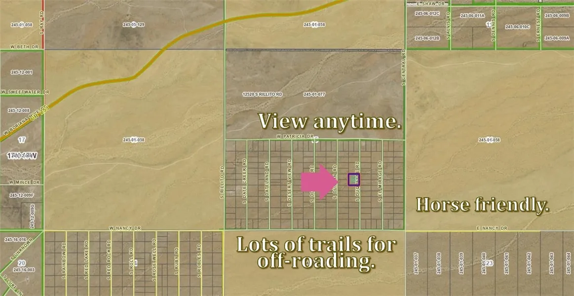 This may be a great camping property. Plenty of trails for off roading, horseback riding and hiking. No hoa fees. No timeframe for use. Drive by and view anytime. Not far off of I-40. Come on out and play in the desert.