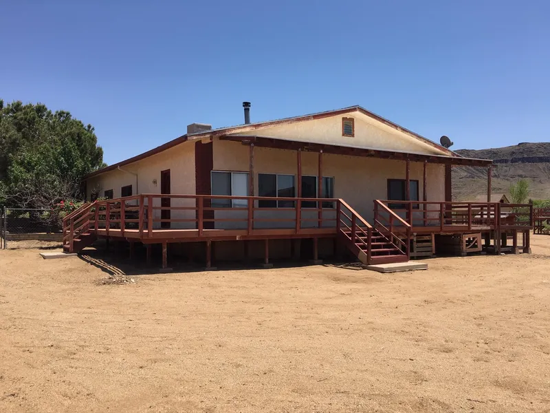 3293 N Kayenta Road. Large 5 bedroom, 3 bath home in Golden Valley on over a half acre. A large wooden deck graces one end of home, a portion of which is covered, and then wraps around 2 of the corners. Mature trees and bushes around the home and part of the perimeter. Lots of animal pens/shelters outside with loads of room for critters to play; and plenty of room for a garden or other hobby. Inside the home, enjoy the rich dark wood floors, white walls, lovely white brick backdrop and pedestal for the wood burning stove, generous windows, and huge family and living rooms; making light spacious living areas. Cooking in the handsome galley kitchen must be a treat; with the double oven, double sinks, and ample counter space, you could whip up a feast in here. The laundry area is just off the kitchen. Master bedroom has carpet, and the closet has large sliding panel-type doors. This affordable and roomy home is close enough to Hwy 68 and Hwy 93 to be very convenient. Call to see before it's gone!