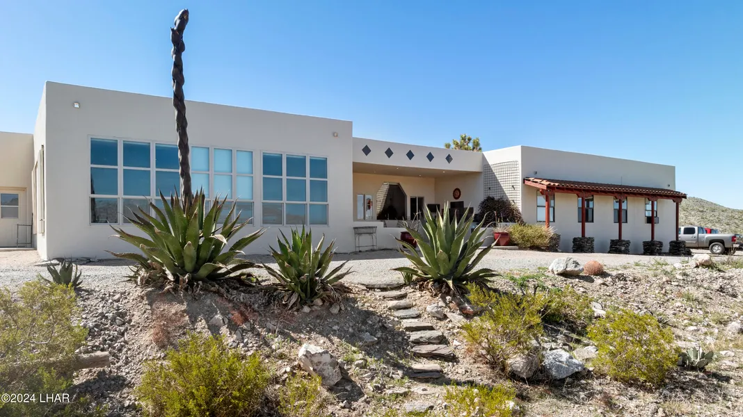 3 Acres in total sitting on a mountain with expansive views of Grand Wash Cliffs. Unique custom home offering 2 bedrooms, a den with a murphy bed, 3 bathrooms. The guest room has an exterior door for guest exit and entry. The open floor plan offers large windows to get the most out of the breathe taking panoramic views. Free standing wood burning stove adds warmth. With the kitchen and dinning area facing the gorgeous mountains you will have plenty to enjoy while enjoying your meal. Tiled island and countertops and Stainless steel appliances. Huge walk-in pantry. Handicap friendly in many ways. Front Patio features a built in BBQ grill with small fridge and storage. There is a new water pumping station and system. Water system includes an 8,000, 2,500 and 1,500 gallon water tanks. New paved driveway going up to the house. There are so many great things about this home its a must see. Roa...
