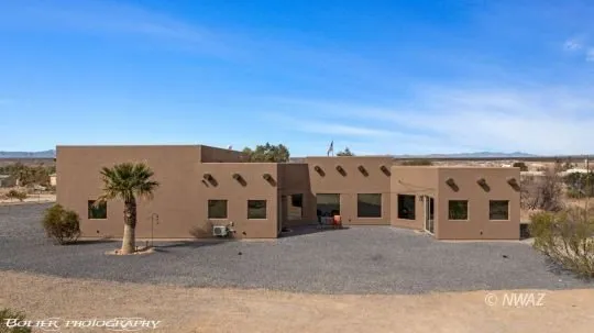Custom built 3375 sq foot home in Desert Springs, AZ. Located on 1.66 acres with beautiful mountain views. Looking for that perfect home with space from neighbors and plenty of room to park toys than you must have a closer look. Massive 1800 sq. ft. five car garage with 14' RV garage. Hand shaped logs over the front entrance and dramatic vaulted ceilings range in height from 9' to 14'. Gorgeous stained concrete floors compliments an open and liveable floorplan. The kitchen boasts double stoves and hoods, custom cabinetry, spacious pantry and center walk-around island. Adjoining dining area & great room perfectly fit each other. All primary windows direct you to the picturesque mountain and desert views with an abundance of natural light. The primary ensuite comes with an oversized beautifully tiled shower and spacious walk-in closet. Even includes your own theater room to be enjoy...