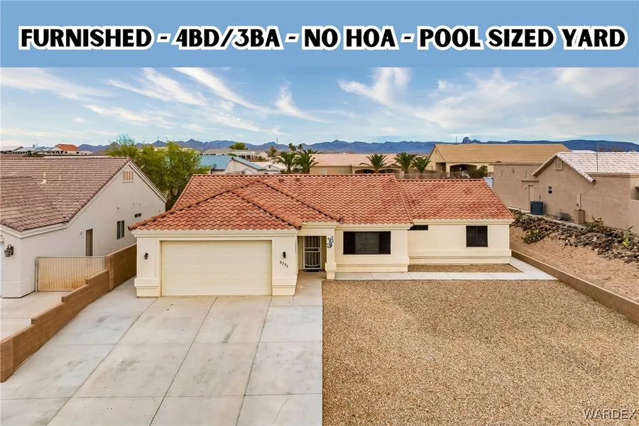 Furnished 4-Bedroom Home in Sun Valley, Fort Mohave! This spacious 4-bedroom, 3-bathroom home in Sun Valley comes fully furnished and move-in ready! With 1,770 sq. ft. of living space, enjoy an open floor plan, vaulted ceilings, and a partially open kitchen with tile countertops, a breakfast bar, pantry, and modern appliances, including a refrigerator (not in photos). The primary suite offers dual sinks and a walk-in shower. Situated on an 8,625 sq. ft. lot backing to a wash, the spacious backyard is a blank canvas ready for your personal touch. With plenty of room for a pool, outdoor entertaining area, or desert landscaping, the possibilities are endless. Enjoy added privacy, mountain views, and the tranquility of having no rear neighbors. With no HOA, and a prime location near shopping and the Colorado River, this is a must-see!