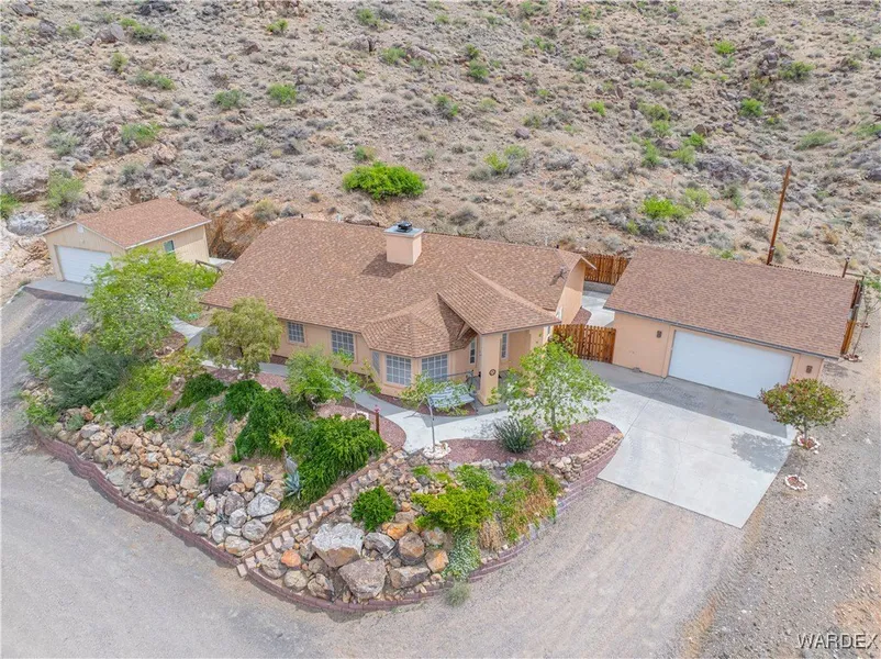 Spectacular city and mountain view from this gorgeous custom built home on one acre lot with absolutely gorgeous views to speak about over the open desert of Golden Valley and the surrounded mountains with ton of privacy in each corner of the property. House offers 4 bedrooms and 2 bathrooms and 3 detach car garages offer 6 parking space including an RV garage. Located in high part of SO-HI neighborhood of Golden Valley, right off of HWY 93 with easy access on paved road. An outdoor large patio with a barbecue area. Few minutes away from shopping and all amenities of Kingman town. Open concept, Eat-in kitchen with solid surface countertop, plenty of cabinets and bar area with high style countertop for barstool seating. Stainless steel appliances in kitchen with recessed lightning. The home has high ceilings with tile flooring throughout the living spaces and carpet in all the bedrooms, window covering throughout the whole house. Open floor plan that attaches kitchen and living spaces and dining area with plenty of room for family gatherings/holidays with a great bar and fireplace on both side living room & Kitchen. For all hosting needs there is a casual dining area , all bedrooms have ceiling fans and roomy closets for storage. A beautiful master bedroom with large full bathroom including a bathtub, double vanity and very large walk-in closets. In house laundry room with plenty of cabinets in laundry room. A three detached garages with an extension area for a workshop. Two of the detached garages are equipped with air-conditioner unit . Well done landscaping in the front-yard with some mature plants and trees as well and large paved area in the back, large covered patio with an ton of privacy in the backyard.