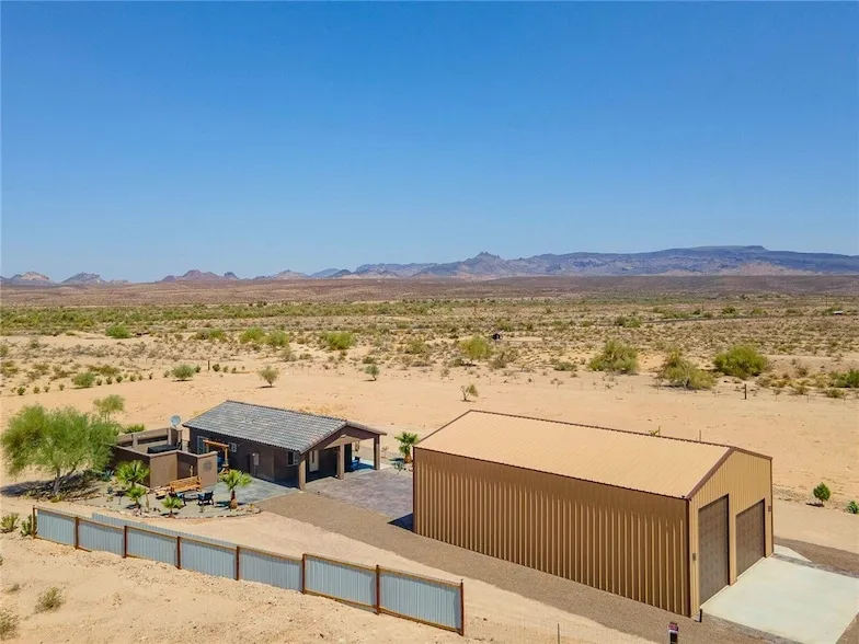Welcome to your peaceful desert retreat in Buckeye Havasu Heights! Built in 2021 and nestled on 4.5 fully fenced acres, this unique property offers privacy, panoramic mountain views, and the perfect blend of functionality and comfort just 30 minutes from Lake Havasu City or Kingman. The cozy main home features 2 bedrooms and 2 bathrooms, with an open layout and beautiful finishes. Step outside to the detached 50x36 RV garage with a 14ft high by 12ft wide door and a 10ft high by 14ft wide door, built in 2024, offering space for RVs, boats, trucks, desert toys, or large gatherings. Inside the garage, you'll find an enclosed, air-conditioned guest suite and gym space with a full bathroom and bedroom ideal for guests or multi-use living. Enjoy the custom mural and pool table. The garage has kitchen cabinetry, a sink and a refrigerator for more storage. All appliances included. This property ...