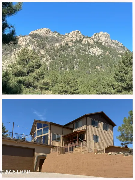 Experience the beauty of mountain living in this stunning Hualapai Mountain retreat, perfectly situated on 1.7 acres. Refreshed with NEW paint inside and out, nicely decorated in a western motif. Comes fully furnished and ready to move into. All pictures do not show the new paint. 1st ones do Breathtaking views. Just two blocks off the main paved road, this property provides easy year-round access while surrounding you with nature's peace and serenity. The main floor showcases a luxurious master suite and a chef's kitchen with stainless steel appliances, abundant cabinetry, and mountain views from nearly every window. A spacious dining room is ideal for family gatherings, while the wet bar-with refrigeration and a nearby half bath-makes entertaining effortless. The family room is truly a showstopper, featuring a dramatic wall of windows framing the iconic Three Peaks and a striking rock-...