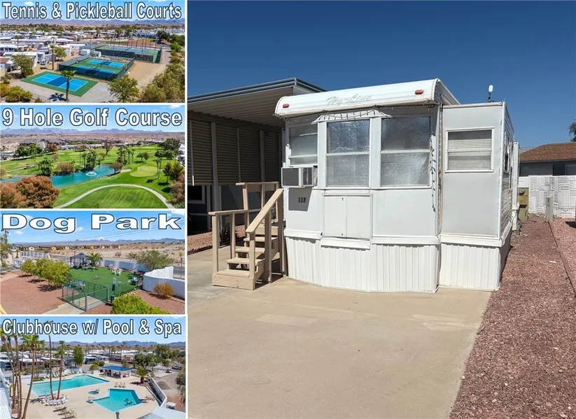 Looking for an active 55+ gated community in the heart of Bullhead City, AZ? If so, come check out the awesome Riverview RV Resort community & this 398 sf 1 bed, 1 bath property that is ready for immediate occupancy. This property is the perfect full-time residence or winter snowbird retreat. Located in this sought after 55+ community, you will meet new friends each & every day as activities in this community are plentiful. An enormous community clubhouse awaits you with its spacious pool & spa area, fitness center, billiards & activities rooms, card room, library, kitchen, & event space. This community even has a pristine 9-hole golf course, tennis & pickleball courts, & a dog park. This home is situated on the perimeter of this community, so it is private & quiet. It offers a covered carport, kitchen with gas stove & plenty of cabinets, in unit stackable laundry, & a detached storage s...