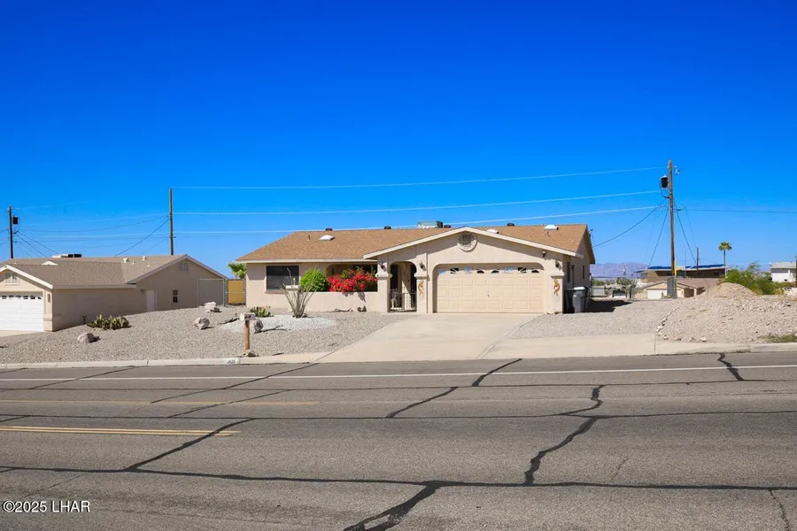 Seller is Motivated! Bring an offer-Adorable Pool Home anyone? Welcome to this spacious 3-bedroom, 2-bath home with a 2-car garage and sparkling fiberglass pool-perfect for Havasu living! Inside you'll find updated Corian counters, generous square footage, split floor plan, with the convenience of an indoor laundry room. Recent upgrades include a newer A/C and a brand-new roof for peace of mind. Plenty of side parking (10+ cars, toys, or RV) makes this property ideal for all your needs. Don't forget the view deck off the back for evening sunsets. Backed to a wash for privacy. Come check out this beauty & fantastic layout!