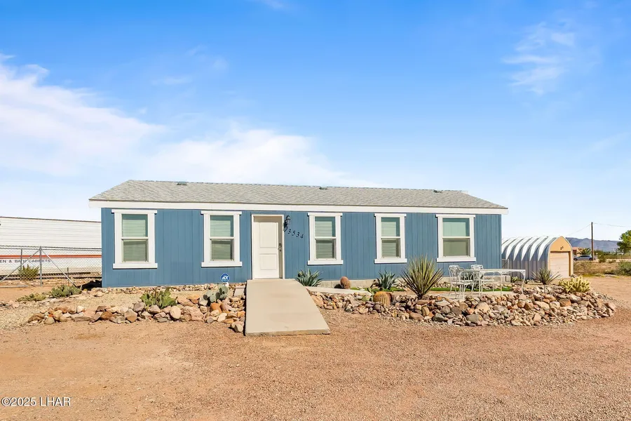 Welcome to 3534 N. Eloy Rd, a charming 3-bedroom, 2-bathroom factory-built home on 2 spacious acres in Golden Valley, AZ. This well-maintained property features an open floor plan with vaulted ceilings, a kitchen island, and modern touches like gas range and refrigerator, perfect for comfortable desert living. Enjoy panoramic mountain views from your property and take advantage of the fully fenced lot with chain-link fencing, ideal for privacy or pets. Located in the peaceful Chloride Spur Ranchos subdivision right off Hwy 68, this home offers city water, septic, and both electric and propane utilities. Those conveniences are worth a lot in this area. In addition the property features a 2-car metal garage, a ready-to-go storage trailer, AND a deck ready to pull up an RV to it (with its own second septic!) Whether you're seeking a full-time residence or a serene getaway, this move-in-ready property blends rural charm with practical convenience. Only 20 minutes from Bullhead City/Laughlin, Lake Mohave, Kingman, and more.