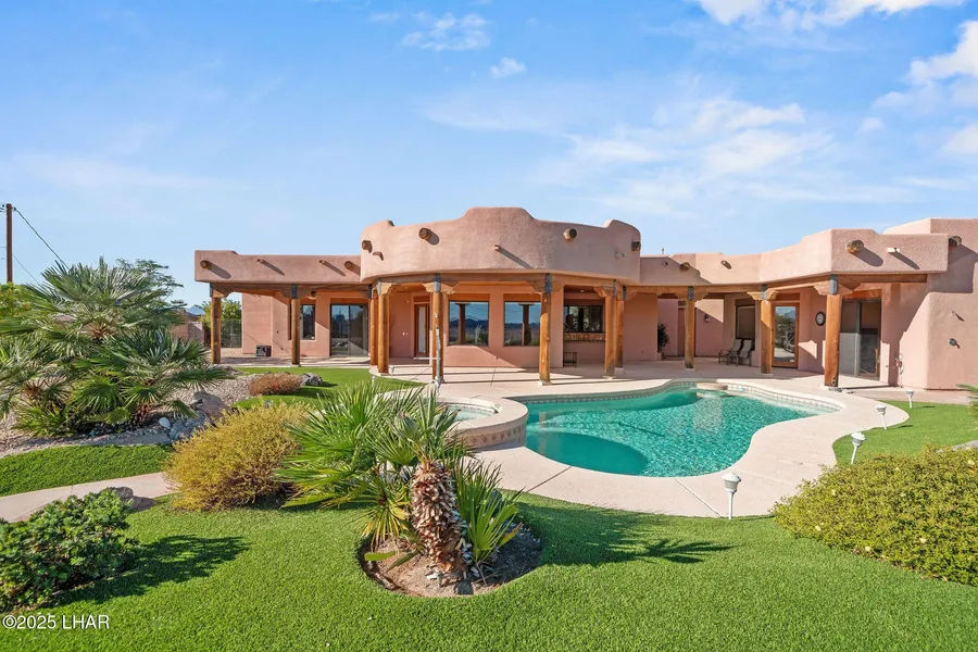 Experience luxury desert living in this stunning 5-bedroom, 5-bath home with a detached casita, set on 1.46 acres of peaceful, private surroundings. Perfect for those who love the Lake Havasu lifestyle, this property offers direct access to the desert for off-roading adventures along with an amazing front lake view to enjoy sunsets! Relax and entertain in the oversized backyard oasis, featuring a private heated pool, expansive patio areas, mature landscaping w/ fruit trees and breathtaking mountain and sunset views. Each bedroom includes a private patio with sliding doors, creating a seamless indoor-outdoor flow and ideal spaces for morning coffee or evening relaxation. A 6-car air-conditioned garage-both attached and detached-plus an oversized parking pad provides ample room for boats, RVs, and all your desert toys. Surrounded by mature landscaping and fruit trees, this home perfectly b...